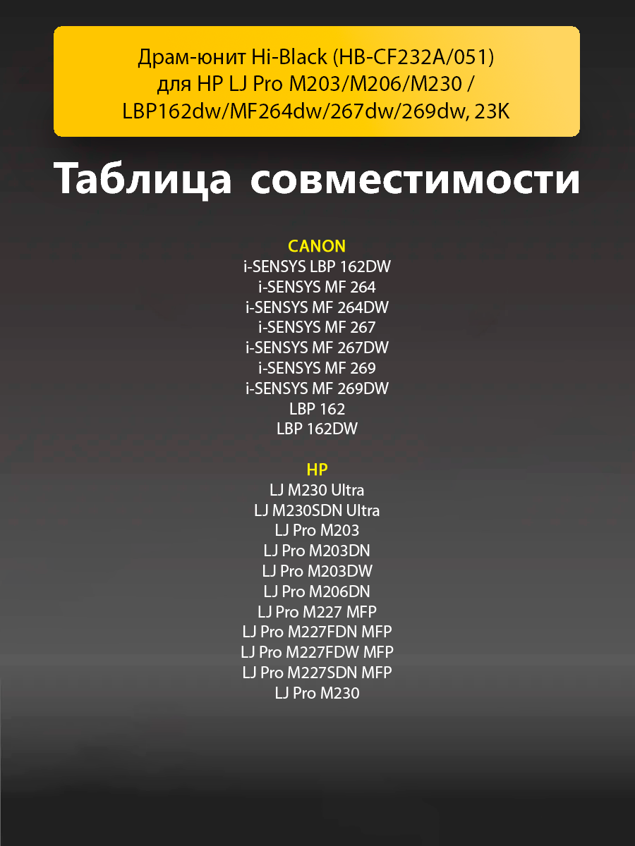 Драм-картридж Hi-Black (CF232A, 051) для монохромных лазерных принтеров и МФУ HP, Canon. Ресурс составляет 23000 копий при 5% заполнении листа (данный показатель может изменяться в виду особенностей тех или иных настроек, выставляемых при печати).