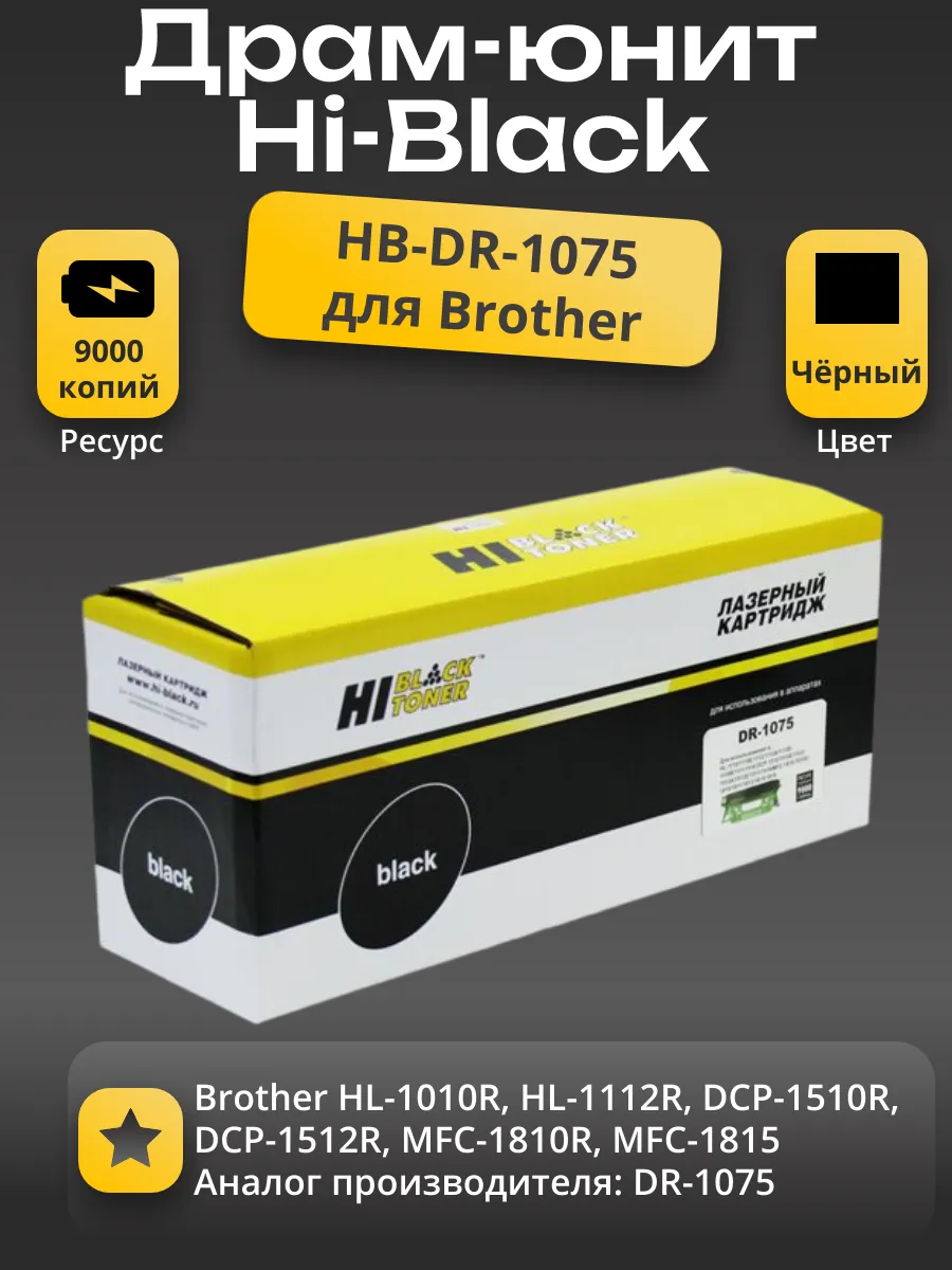 Драм-картридж Hi-Black (DR-1075) для лазерных принтеров и МФУ Brother. Ресурс составляет 9000 копий при 5% заполнении листа (данный показатель может изменяться в виду особенностей тех или иных настроек, выставляемых при печати).