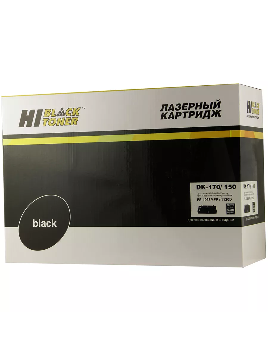 Универсальный драм-картридж Hi-Black (DK-170/ DK-150) для монохромных лазерных принтеров и МФУ Kyocera. Ресурс составляет 100000 копий при 5% заполнении листа (данный показатель может изменяться в виду особенностей тех или иных настроек, выставляемых при печати).