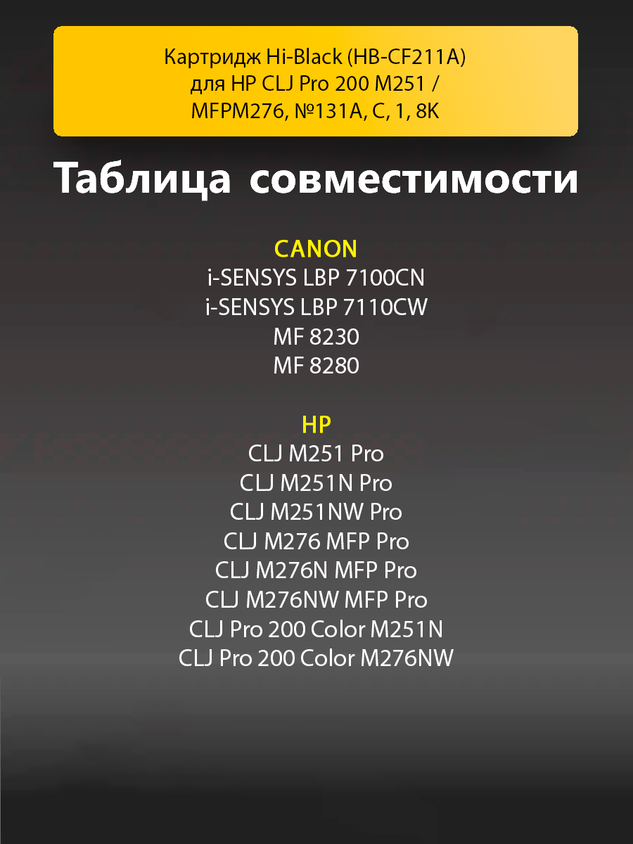 Совместимость с печатающими устройствами: HP Color LJ Pro 200 Color M251, MFP M276, Canon LBP-7110C, LBP-7100C, LBP-7100Cn, LBP-7110Cw, MF-8280Cw, MF-8230Cn