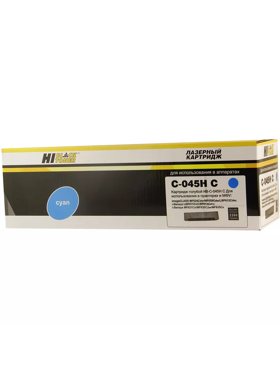 Картридж Hi-Black (045H C) увеличенной ёмкости для полноцветных лазерных принтеров и МФУ Canon. Ресурс составляет 2200 копий при 5% заполнении листа (данный показатель может изменяться в виду особенностей тех или иных настроек, выставляемых при печати).