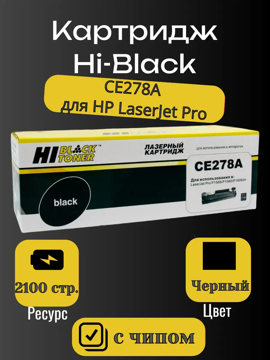 Картридж Hi-Black (HB-CE278A, 78A) для лазерных принтеров и МФУ HP. Ресурс составляет 2100 копий при 5% заполнении листа (данный показатель может изменяться в виду особенностей тех или иных настроек, выставляемых при печати).