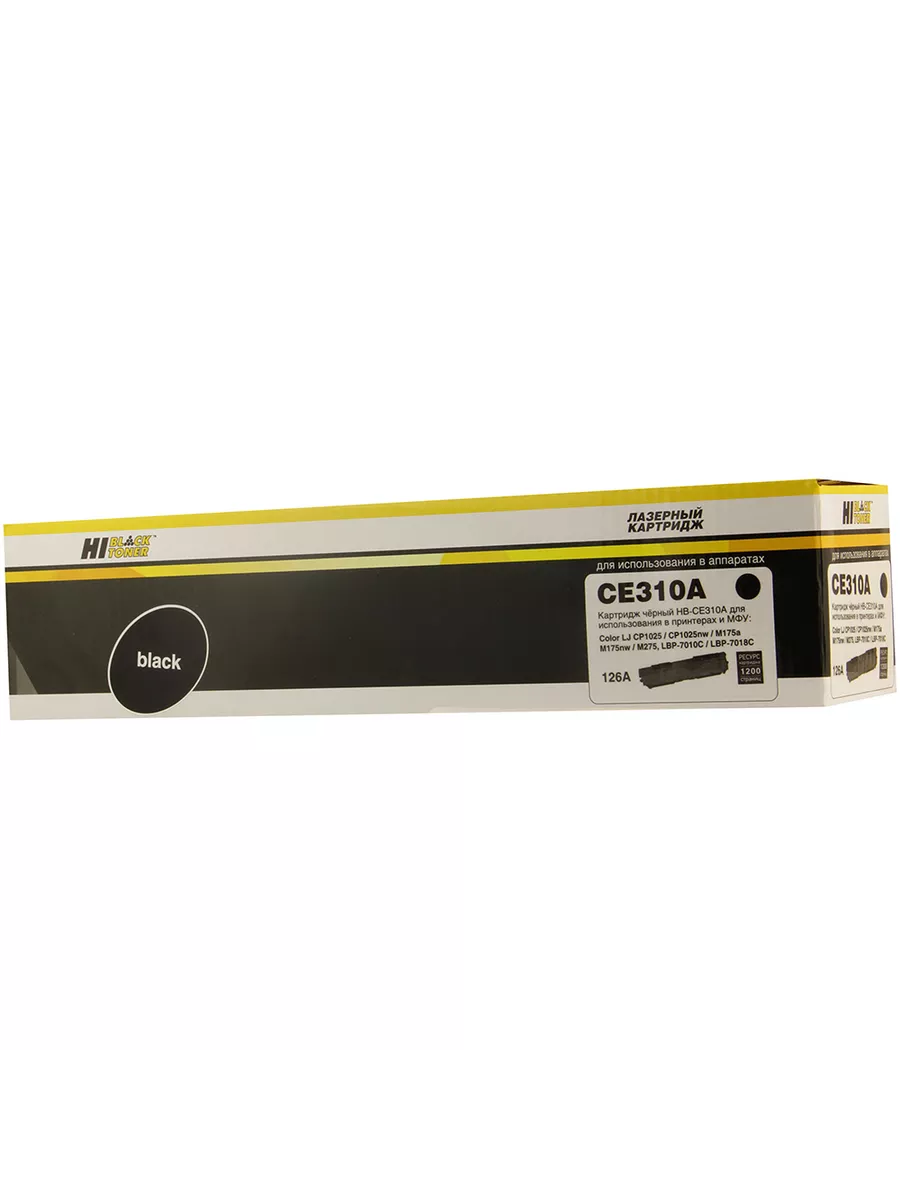 Тонер-картридж Hi-Black (CE310A, 126A) для цветных лазерных принтеров и МФУ HP. Ресурс составляет 1200 копий при 5% заполнении листа (данный показатель может изменяться в виду особенностей тех или иных настроек, выставляемых при печати).