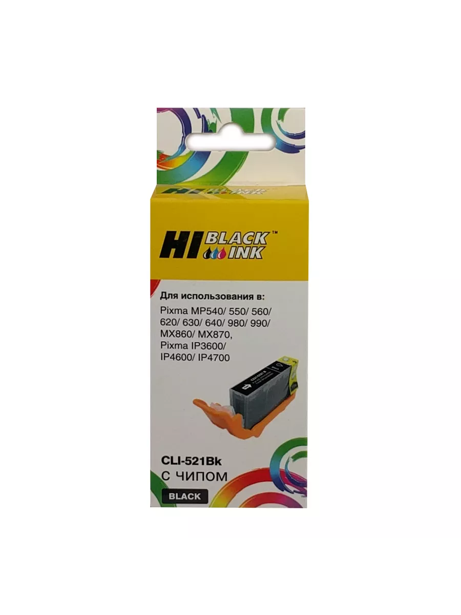Струйный картридж Hi-Black (CLI-521BK) для цветных принтеров и МФУ Canon. Объем чернил: 9 мл. Ресурс составляет 350 копий при 5% заполнении листа (данный показатель может изменяться в виду особенностей тех или иных настроек, выставляемых при печати).