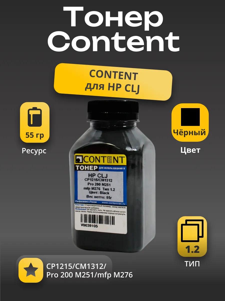 Тонер Content для HP CLJ CP1215/CM1312/Pro 200 M251/mfp M276, Тип 1.2, Bk, 55 г, банка - это высококачественный черный тонер, специально разработанный для совместимости с принтерами HP, включая модели CLJ CP1215, CM1312, Pro 200 M251 и mfp M276. Этот тонер обеспечивает четкую и стойкую печать с высоким качеством изображения. С удобной упаковкой в виде банки весом 55 грамм, он легко устанавливается и обеспечивает надежную работу вашего принтера. Идеальный выбор для профессиональной и повседневной печати.
