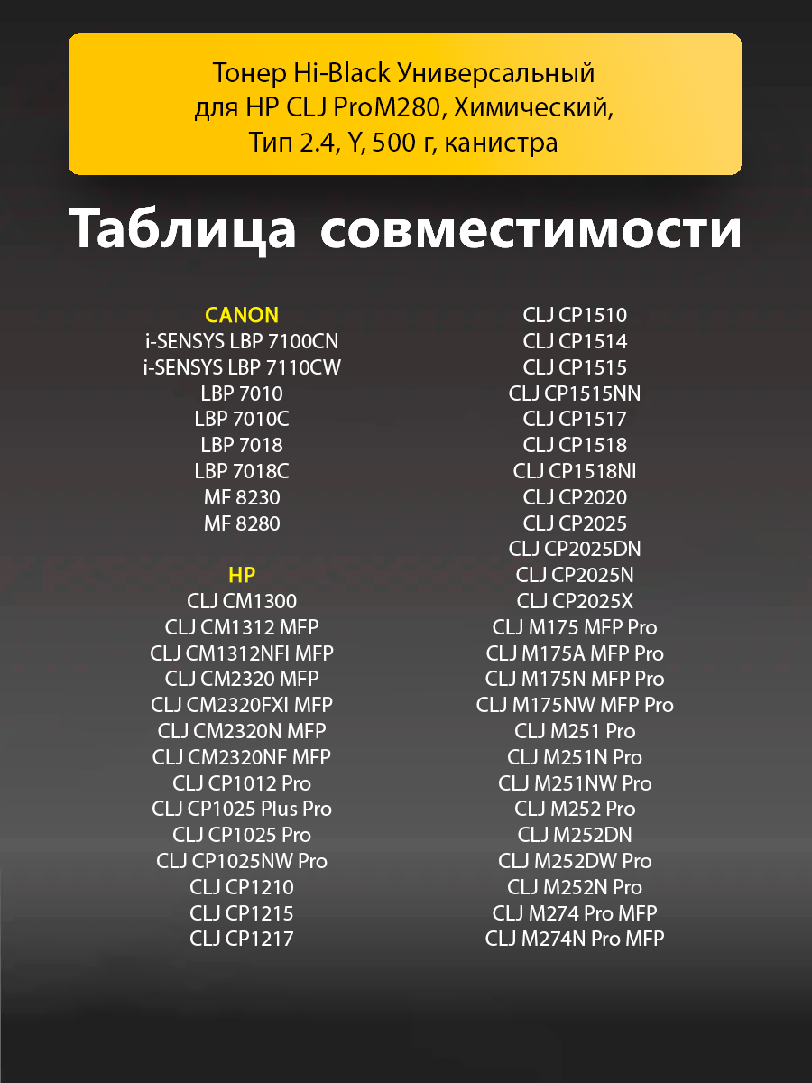 Тонер Hi-Black Универсальный для HP CLJ ProM280, Химический, Тип 2.4, Y, 500 г, канистра