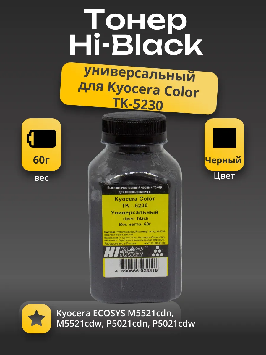 Тонер Hi-Black для заправки картриджей цветных лазерных принтеров и МФУ Kyocera моделей: TK-5220K, TK-5230K