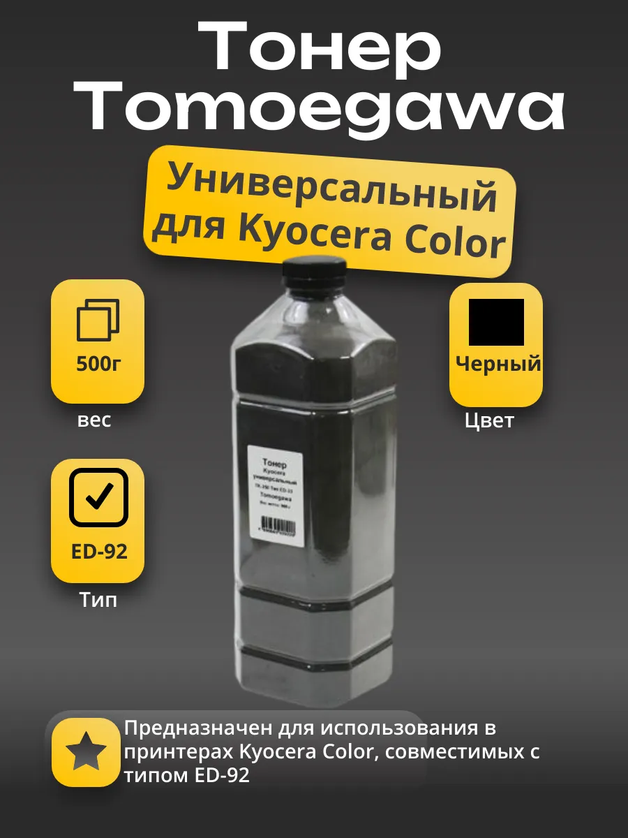 Тонер Tomoegawa Универсальный для Kyocera Color, Тип ED-92, Bk, 500 г, канистра - это качественный универсальный черный тонер, предназначенный для использования в принтерах Kyocera Color, совместимых с типом ED-92. Этот тонер обеспечивает выдающееся качество печати с четкими и насыщенными черными оттенками. Благодаря крупной емкости в 500 грамм, он обеспечивает длительное использование, что делает его идеальным выбором для профессиональной печати и повседневных печатных задач.