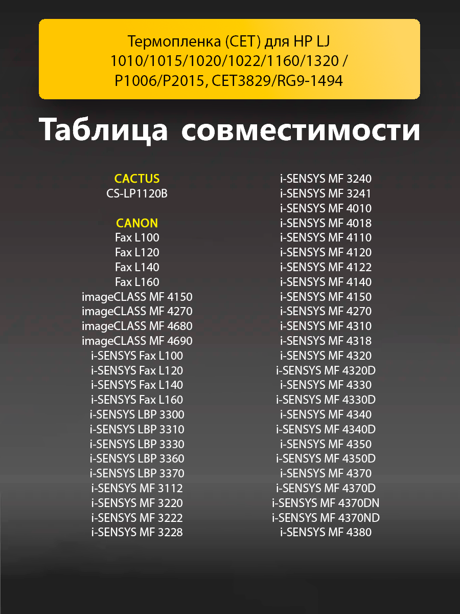 Термопленка (CET) для HP LJ 1010/1015/1020/1022/1160/1320/P1006/P2015, CET3829/RG9-1494